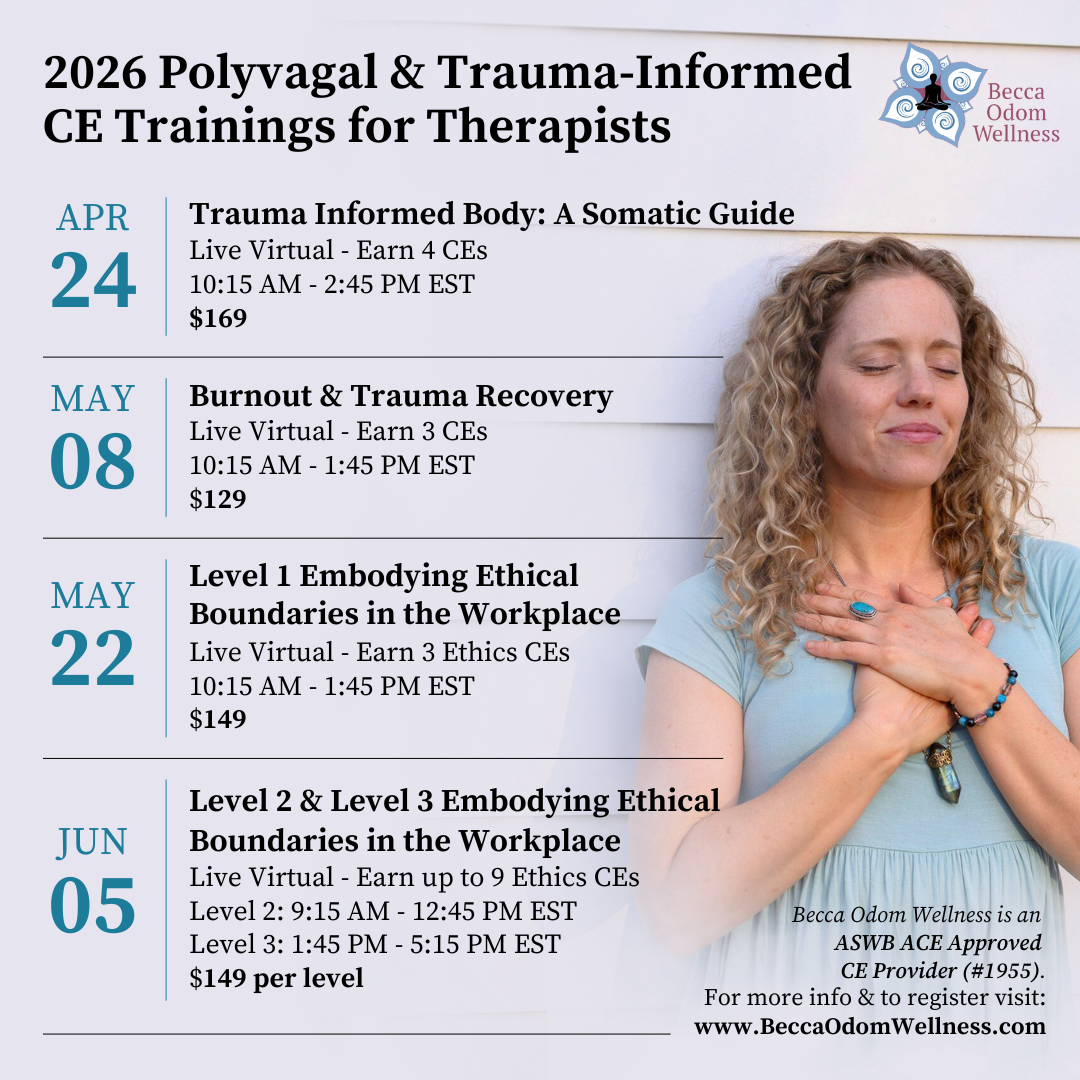 Becca Odom Wellness is a Continuing Education (CE) training center that provides somatic and trauma-informed trainings that foster nervous system regulation, resilience, and embodied healing for mental health professionals.
